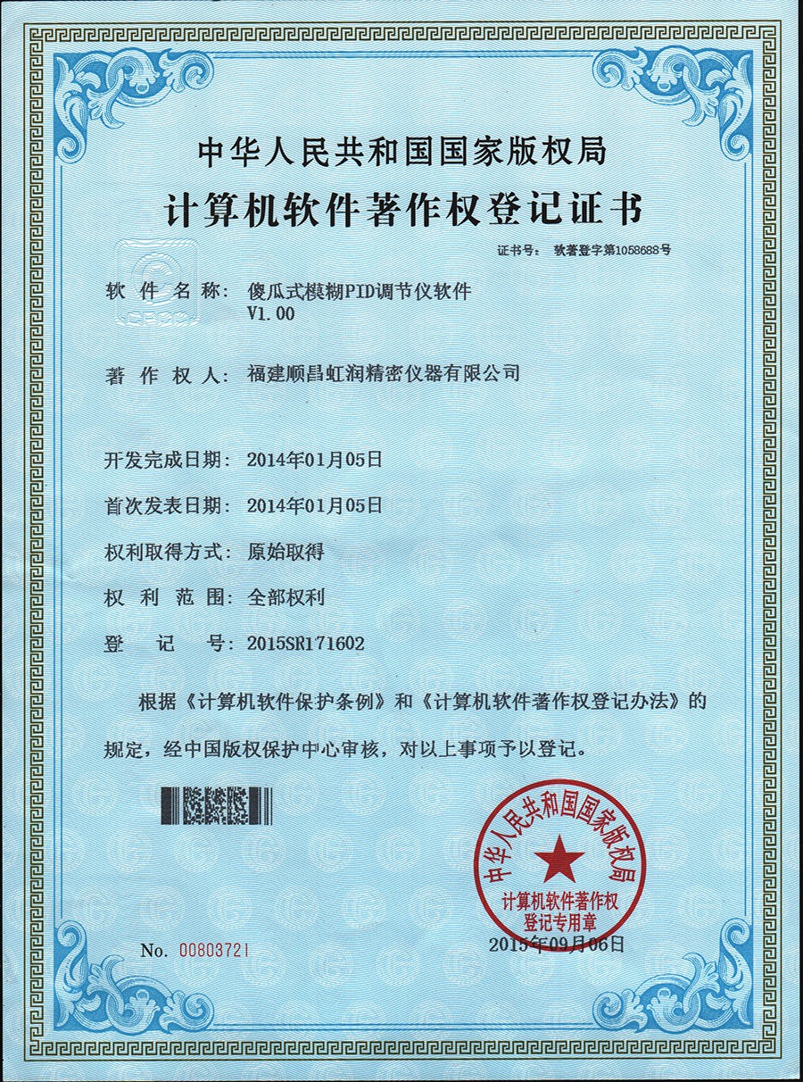 虹潤公司人工智能算式與模糊PID算式是虹潤公司應用自主知識產權開發的新一代智能溫控儀表,產品榮獲一種人工智能調節器及其調節方法(專利號:2016107742425)、模糊PID控制儀及控制方法(專利號2015109378814)、一種智能化控制器及自整定方法(專利號2016103155465)、閥門自動、手動無擾動操作控制方法及裝置(專利號2007101540083)4項國家發明專利,NHR人工智能模糊PID調節器(版權登記號2009SR044371)傻瓜式模糊PID調節儀軟件V1.00 (版權登記號2015SR171602)2項軟件著作權。