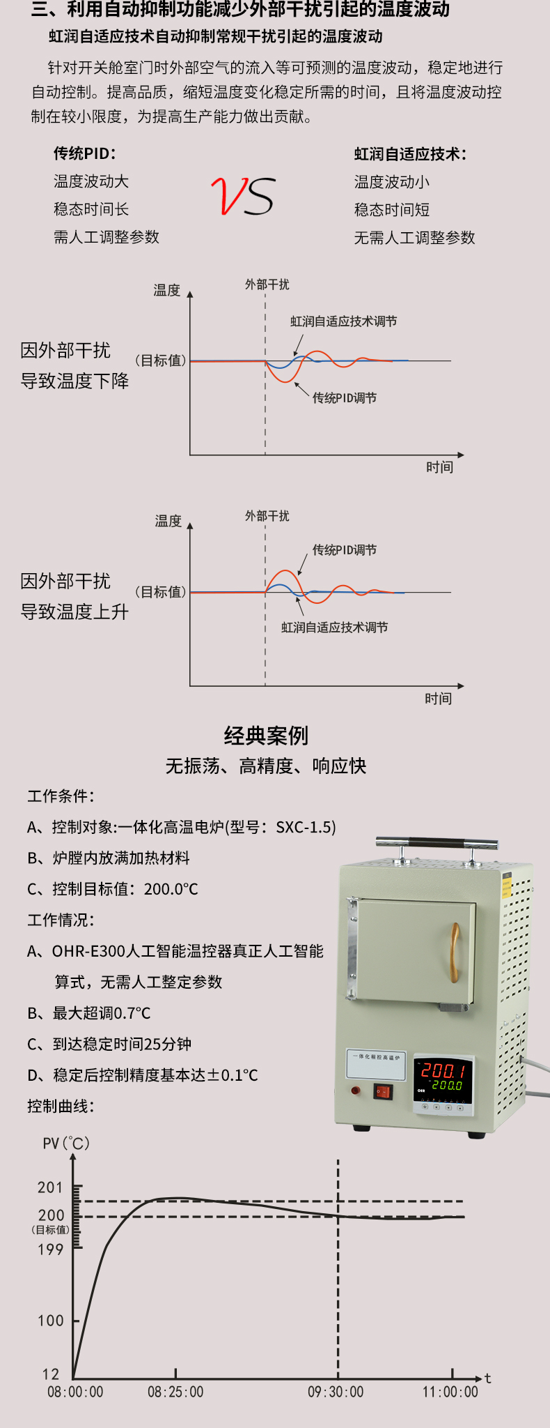 虹潤公司是專業生產溫控器的國家專精特新“小巨人”企業。生產的人工智能溫控器,具有真正人工智能算式,無需人工整定參數,控制精度可達±0.1°C,多種輸出類型,高抗干擾等特點。產品獲得模糊PID控制儀及控制方法、人工智能調節器、智能化控制器、移相觸發控制器、閥門自動手動無擾動操作控制方法及裝置等5項國家發明專利,主持起草工業過程控制系統用模擬輸入兩位或多位輸出儀表、物聯網智能溫度儀表通用技術條件、工業過程測量和控制系統用智能調節器等3項國家標準,以及通信系統多通道數據采集控制終端規范軍用標準,參與國際5G標準制定,取得模糊PID溫控儀等3項相關軟件著作權。產品廣泛應用于電力、石化,冶金、制藥、食品等幾乎所有工業現場,實現精準控溫,保障生產安全與質量。