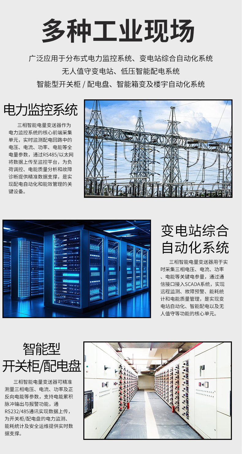 虹潤公司是專業生產電流傳感器的國家專精特新“小巨人”企業。生產的三相智能電量變送器,具有多種電參數測量,正反向電能累積,多種輸出信號,導軌壁掛共用, RS485/RS232通訊等特點。產品獲得基于一種交流信號變送器、交直流信號轉換電路、基于DCS技術的盤裝式三相電量表等3項國家發明專利,主持起草工業過程控制系統用模擬輸入兩位或多位輸出儀表國家標準,直流漏電流傳感器規范、通信系統多通道數據采集控制終端規范等2項軍用標準,以及現場設備集成等5項智能制造國家標準,參與國際5G標準制定,取得液晶綜合電量集中顯示儀等2項相關軟件著作權。產品廣泛應用于電力、冶金、化工、水泥、造紙、新能源、基礎設施等用電密集行業。