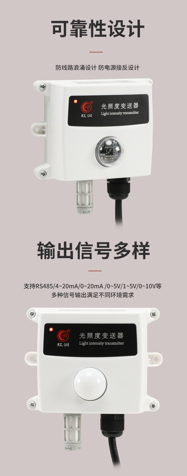 虹潤公司是專業生產環境監測儀表的國家專精特新“小巨人”企業。生產的光照度變送器,具有高精度感光傳感器,響應靈敏,準確度高,低功耗,模擬量變送輸出或RS485通訊等特點。產品獲得一種農業監控變送器、一種儀表電源等2項實用新型專利,主持起草現場設備集成等5項智能制造國家標準,以及現場設備工具(FDT)接口規范、物聯網總體技術智能傳感器特性與分類等2項國家標準,參與國際5G標準制定,取得農業監測變送器等3項相關軟件著作權。產品廣泛應用于溫室大棚、花卉養殖、科研實驗、智能樓宇、戶外照明等環境場合對光照度的檢測。