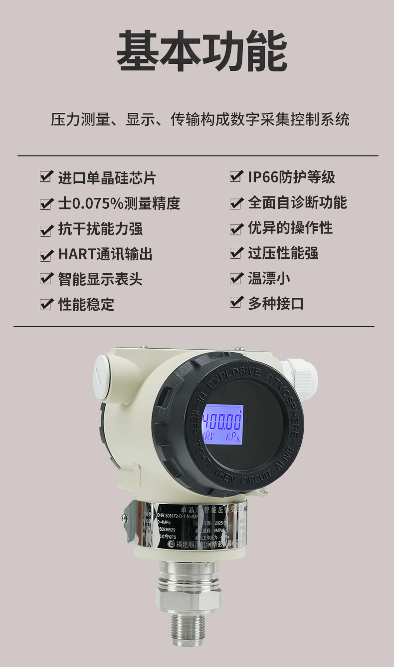 虹潤公司是專業生產壓力變送器的國家專精特新“小巨人”企業,生產的單晶硅壓力變送器,具有高精度,小溫漂,性能穩定,帶HART通訊,抗干擾能力強,自診斷功能等特點。產品獲得一種數字顯示低功耗壓力表、一種信號發生器裝置等2項國家發明專利,主持起草工業過程控制系統用模擬輸入兩位或多位輸出儀表、工業過程測量和控制系統用壓力/差壓變送器等2項國家標準,通信系統多通道數據采集控制終端規范軍用標準,以及現場設備集成等5項智能制造國家標準。參與國際5G標準制定,取得數顯壓力表等2項相關軟件著作權。產品廣泛應用于化工、食品、制藥、電力、設備配套、供暖、水處理、樓宇等行業,需精準測量流體壓力的現場。